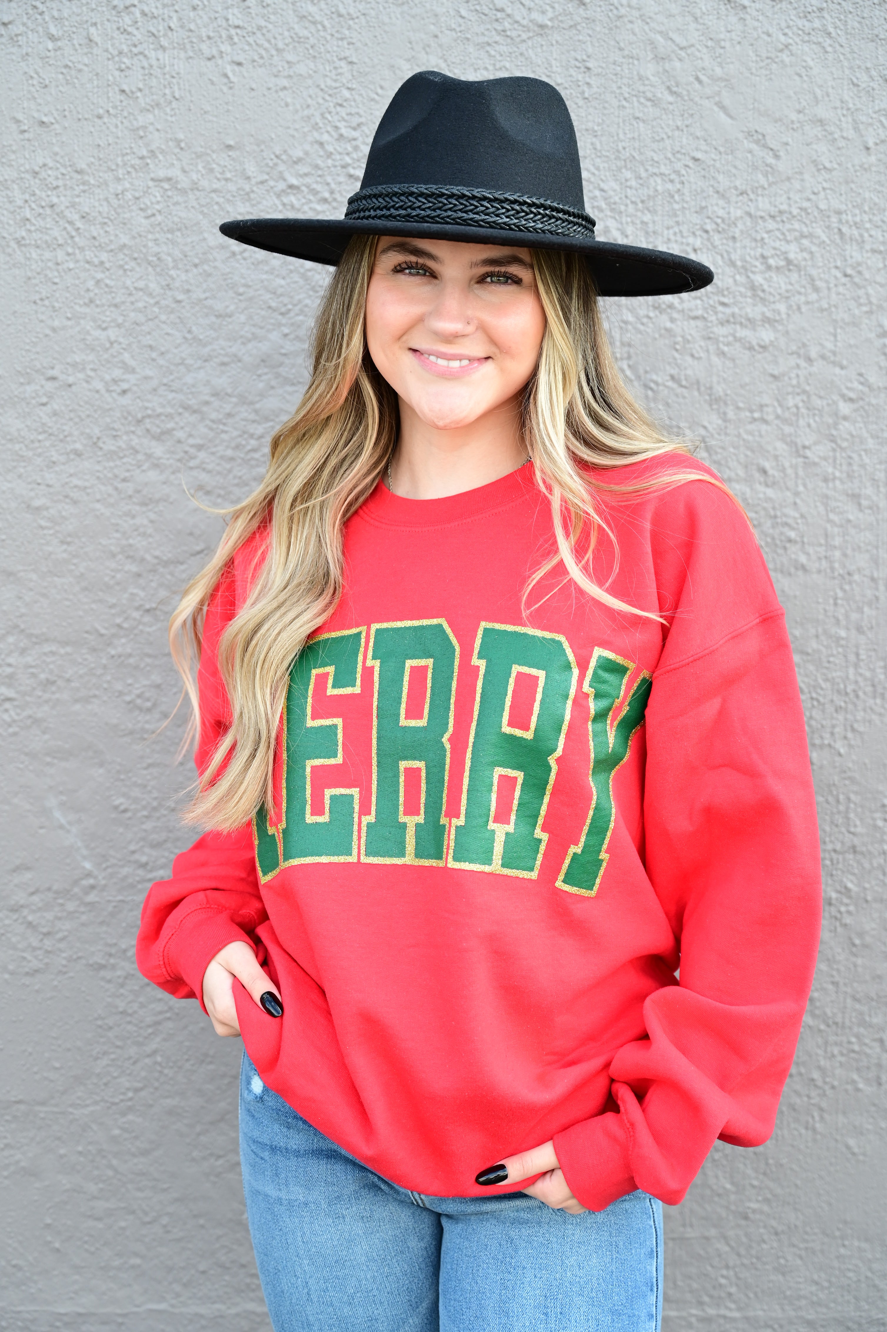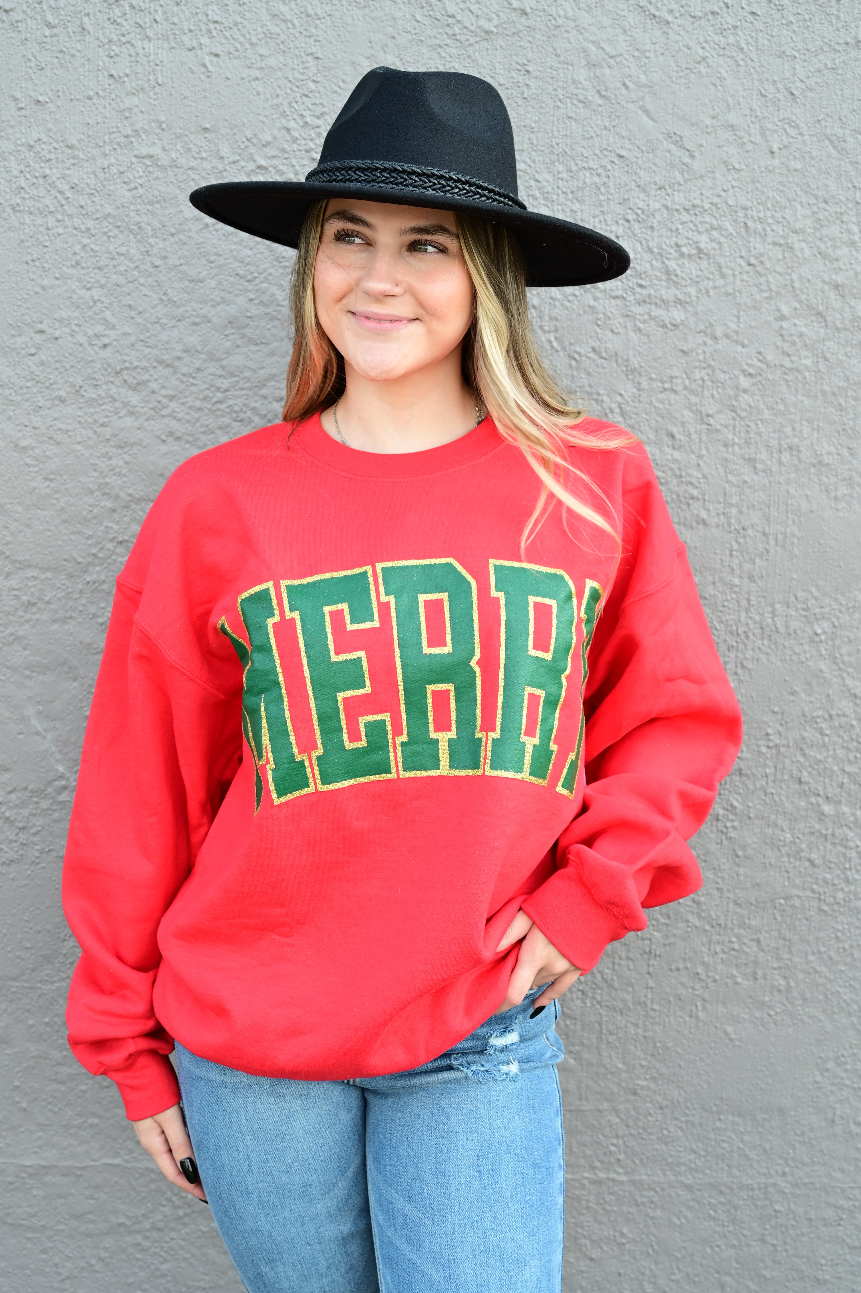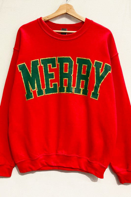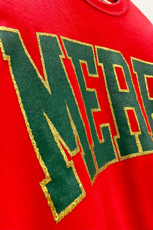LONG SLEEVE CREW-NECK GARMENT-DYED GLITTER-OUTLINED "MERRY" GRAPHIC OVERSIZED HOLIDAY SWEATSHIRT